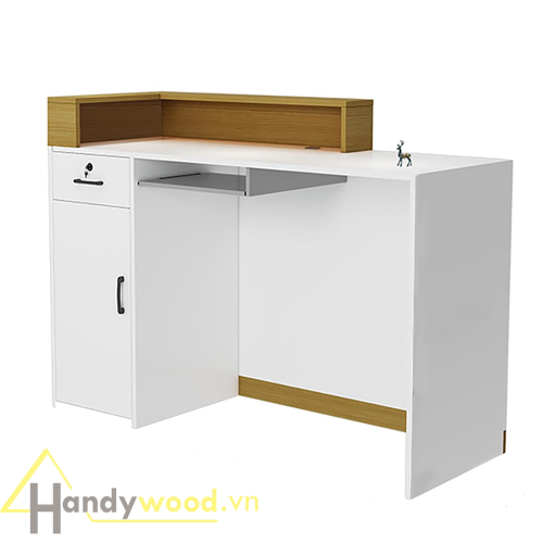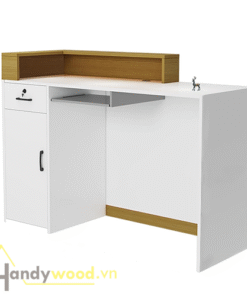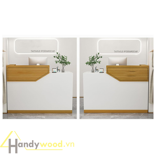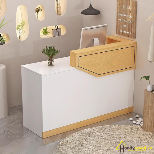 Mẫu quầy thu ngân nhỏ thiết kế thanh lịch QTN106 của Handywood gây ấn tượng với kiểu dáng đơn giản nhưng không kém phần tinh tế. Tông màu trắng kết hợp viền gỗ sáng giúp tạo cảm giác hiện đại, nhẹ nhàng, rất phù hợp với các không gian nội thất tối giản như: