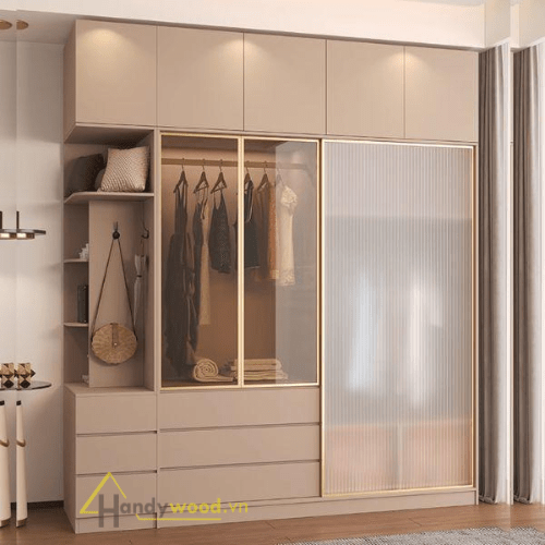 Chất liệu: Gỗ MDF chống ẩm phủ Melamine cao cấp, cánh kính sọc mờ viền nhôm.