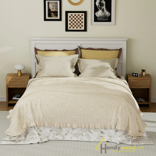 Phối cùng giường ngủ MDF màu trắng, hoặc tường màu pastel để tạo độ tương phản tinh tế