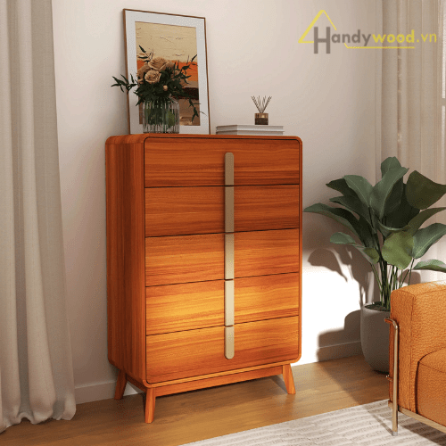 Với thiết kế bo tròn các cạnh tạo cảm giác mềm mại và an toàn, tủ trang trí cao cấp MDF gồm 6 ngăn kéo lớn có thể dễ dàng chứa đồ chơi, quần áo, phụ kiện hoặc tài liệu. Tay nắm kim loại mạ vàng nổi bật giữa nền gỗ màu nâu ấm mang đến vẻ ngoài thanh lịch và sang trọng.