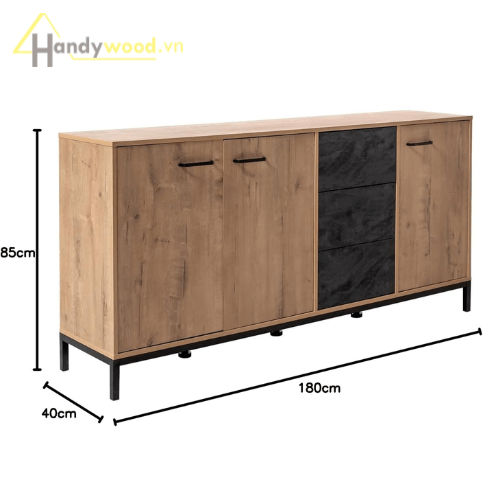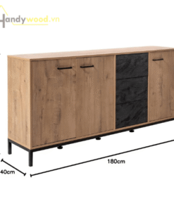 Kiểu dáng hình khối vuông vức, kết hợp gỗ vân sồi tự nhiên và điểm nhấn mặt ngăn kéo đen đá ấn tượng.